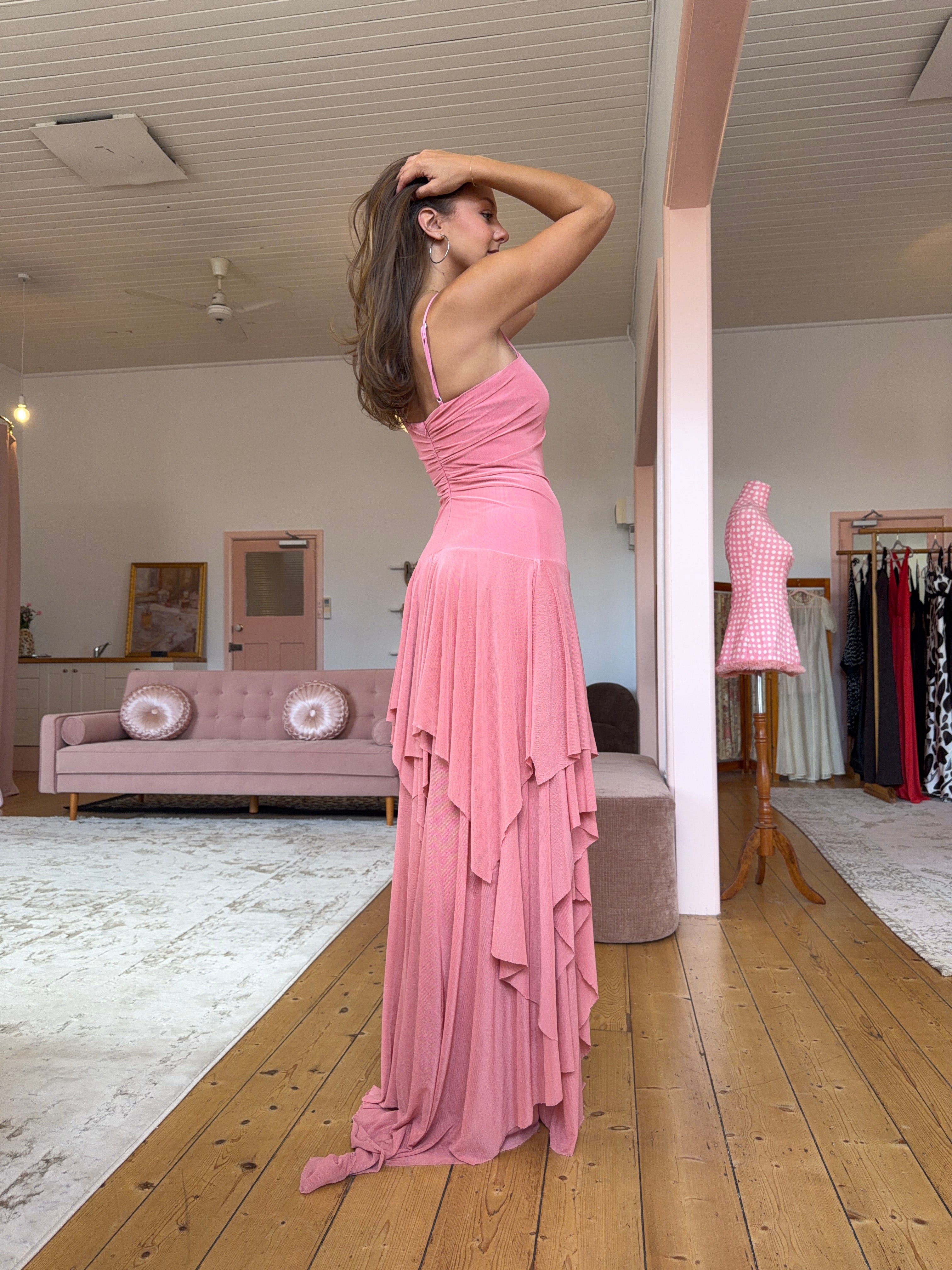 The Vintage Nina Dress is a rose pink maxi featuring a drop waist and a flowy, multi-length skirt. Crafted from soft, stretchy fabric it is not only comfortable, but creates amazing shape at the skirt. Perfect for formal events or black tie wear!