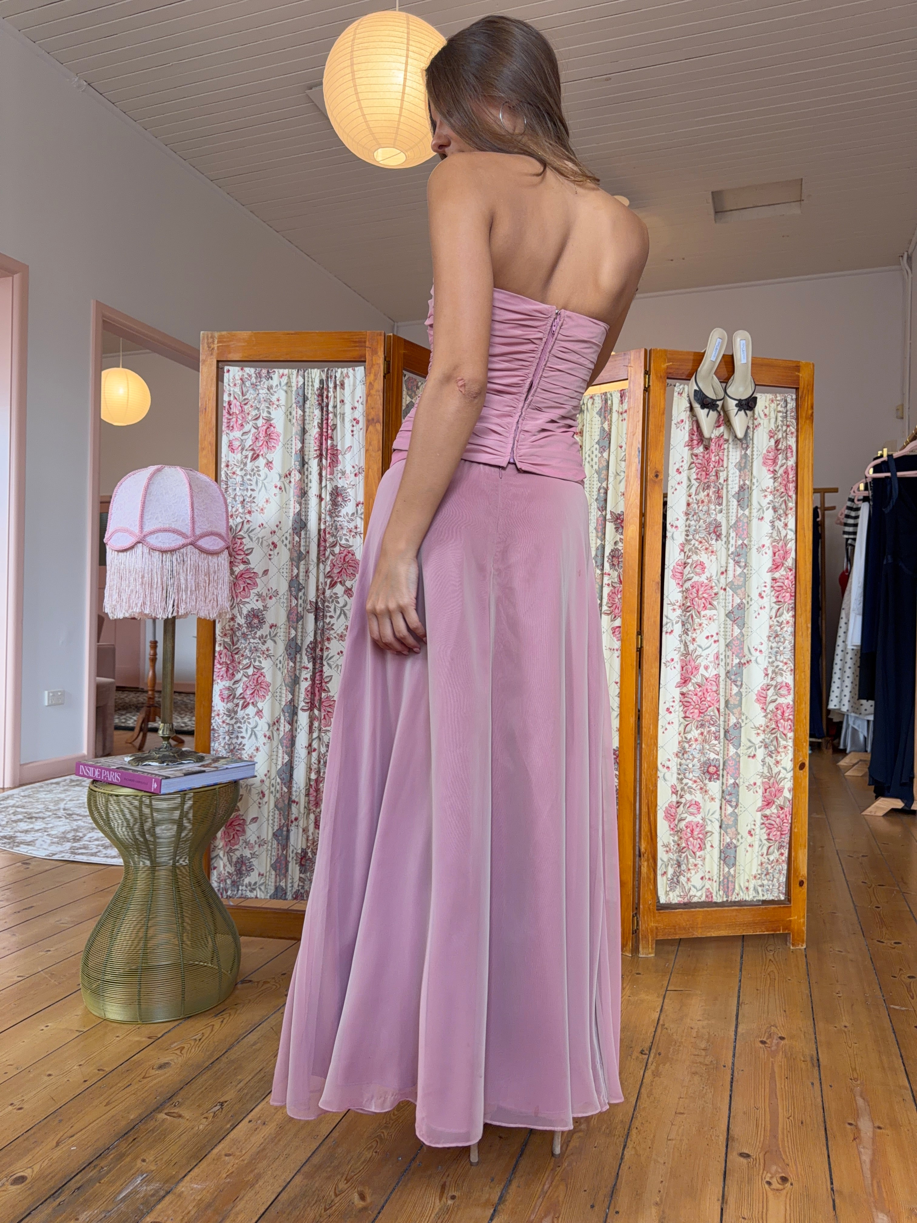 The Vintage Wren Set is a standout blush pink two-piece, featuring a pleated strapless top and a low rise maxi skirt. Made from a unique sheen fabric that changes colour in different lighting. Both the top and skirt have zippers.