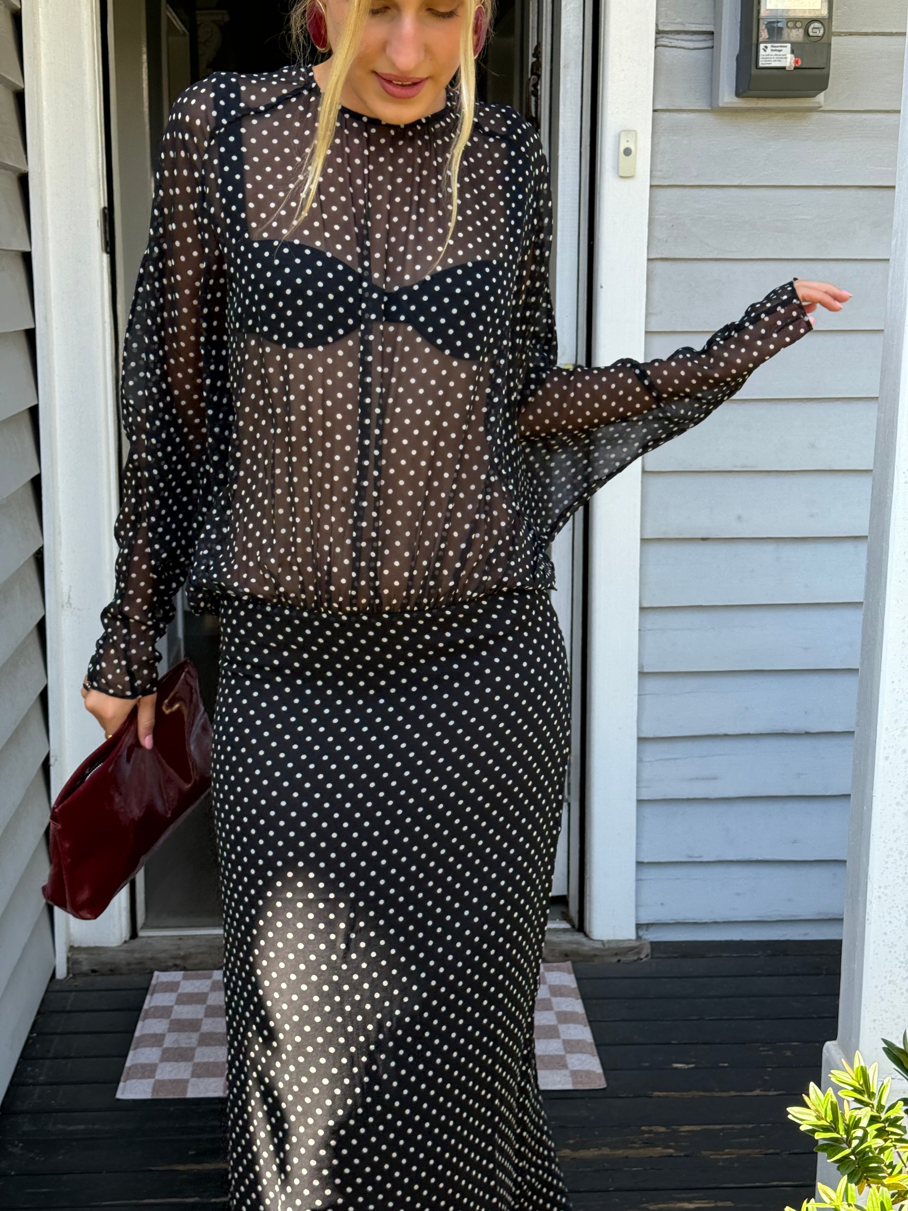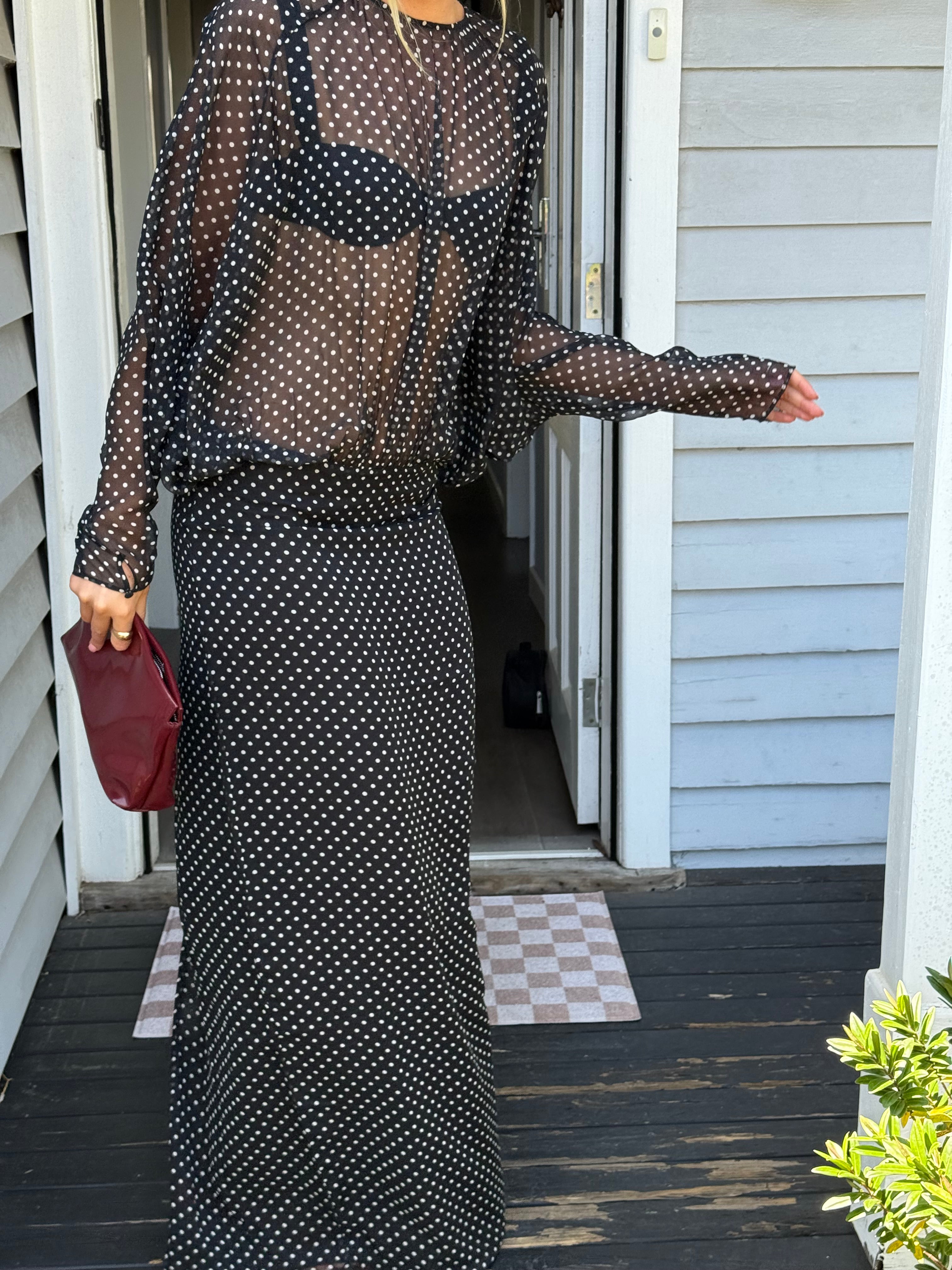 Crafted from pure silk chiffon, this piece features a back keyhole and a hidden zip for a clean finish. Semi-sheer and partially lined with a back slit for movement. We provide a complimentary black bikini top to wear with the dress (Size S).