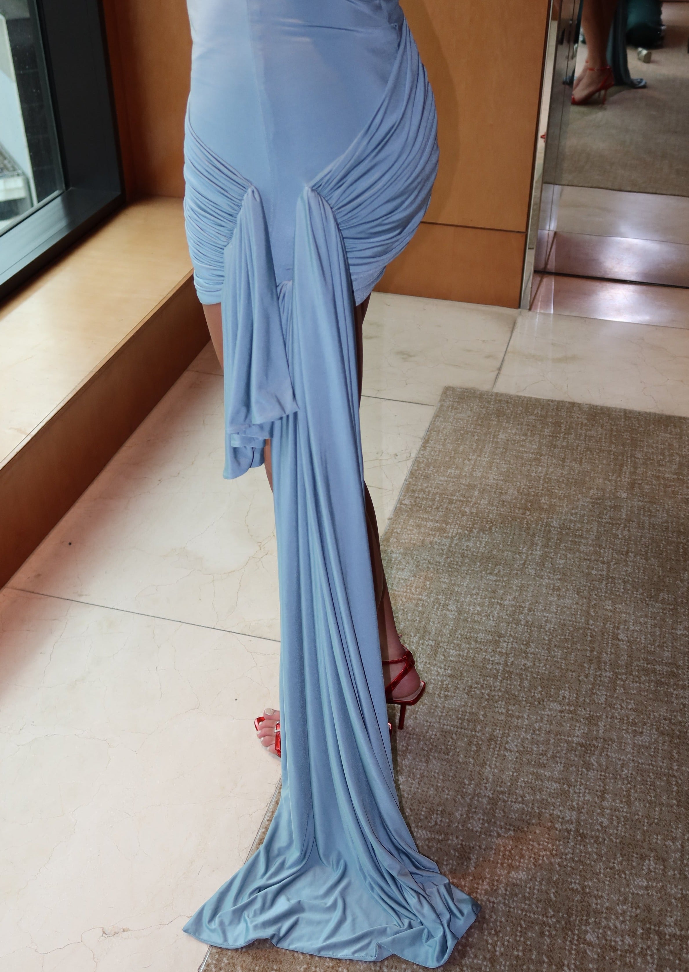 Introducing the Juno Dress in Eucalyptus from Effie Kats - featuring an adjustable sash length, giving you the flexibility to wear it short to prevent dragging or lengthen it for photo moments. Crafted from premium stretch-jersey fabric, this mini dress embodies luxury and comfort.