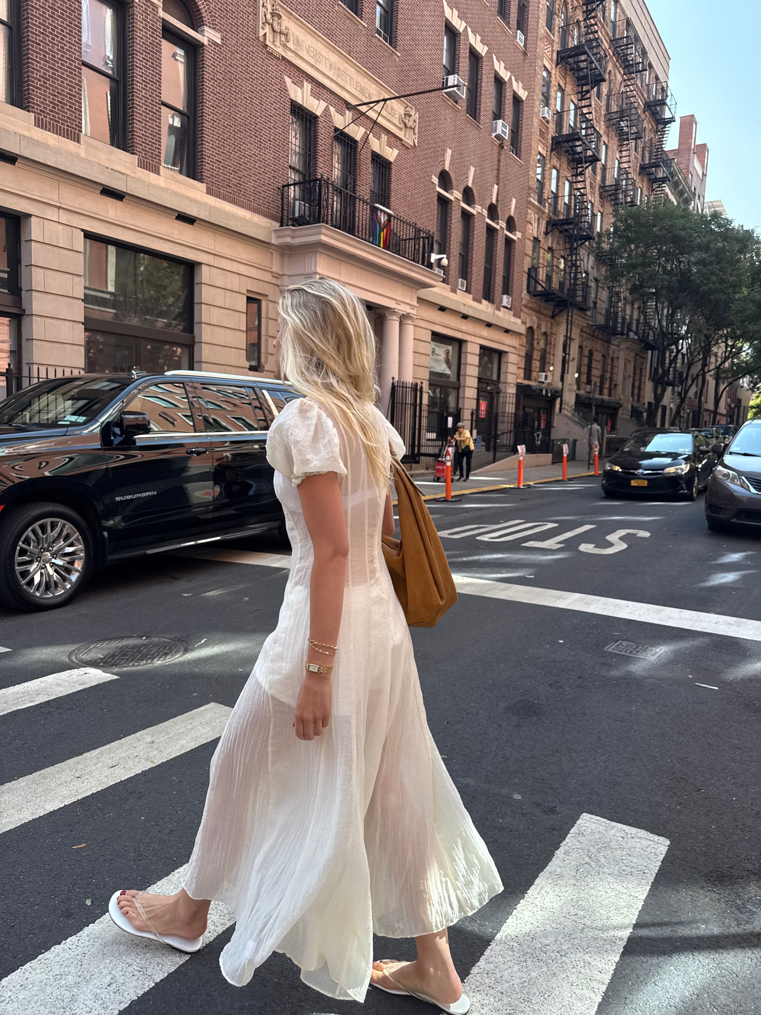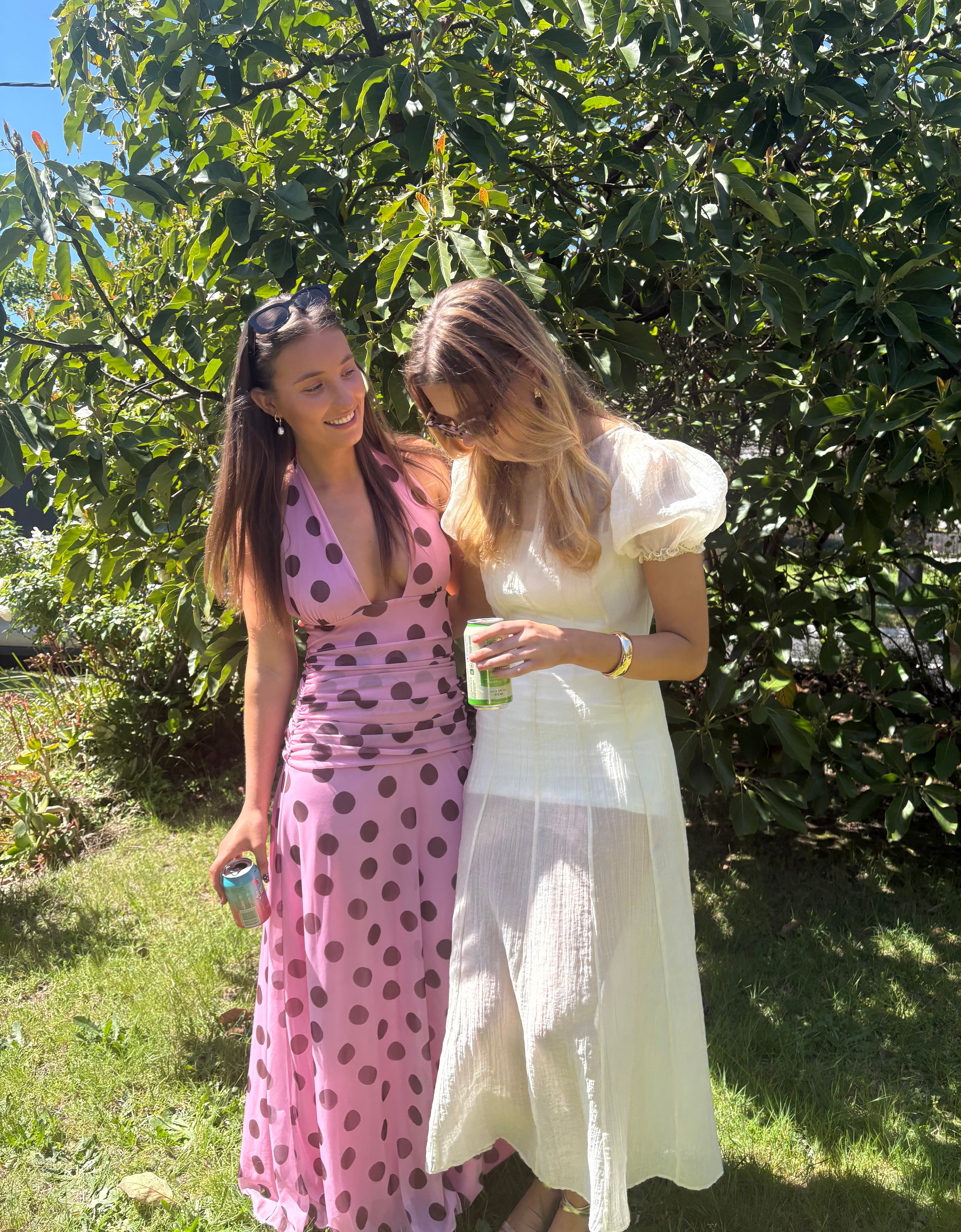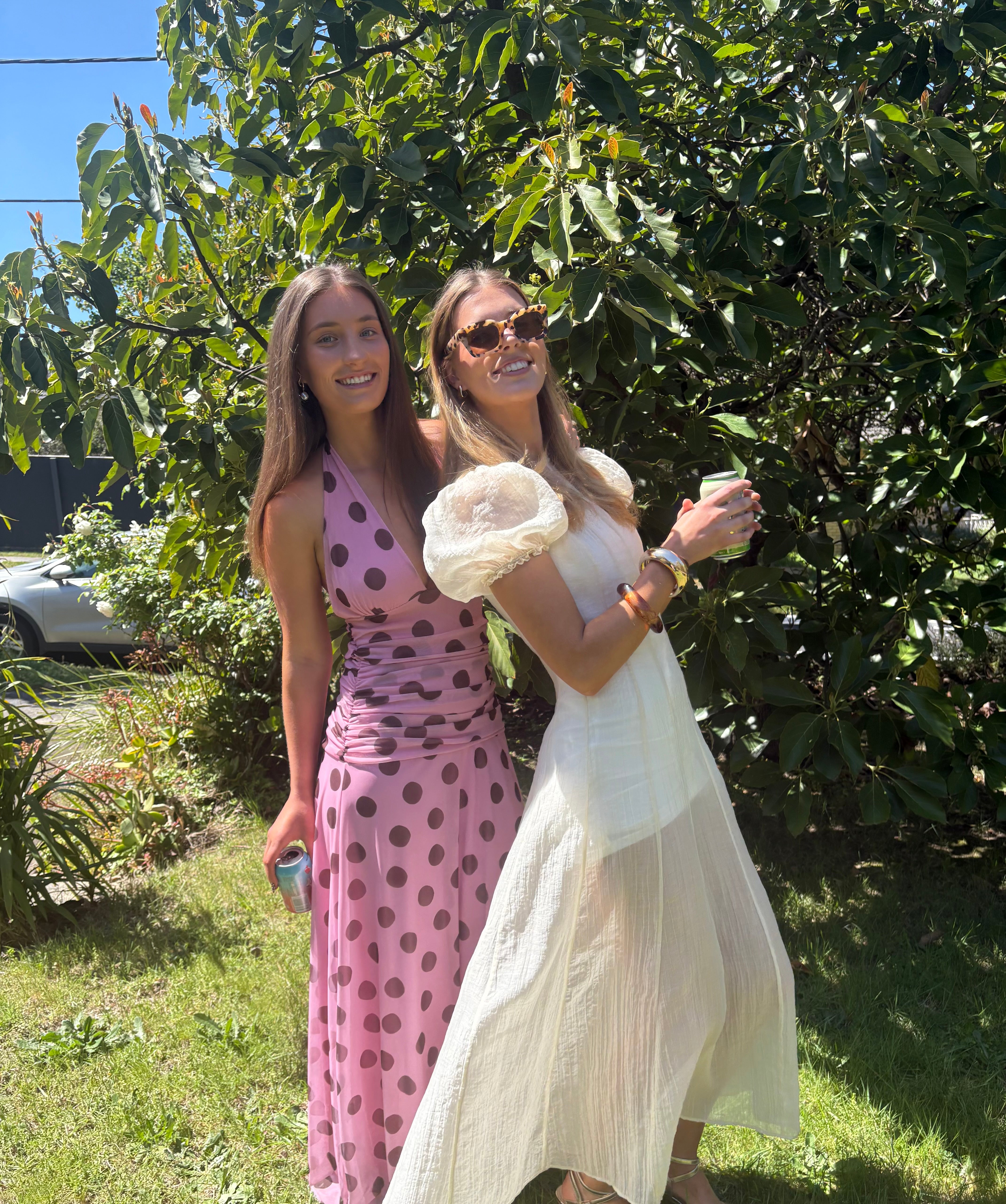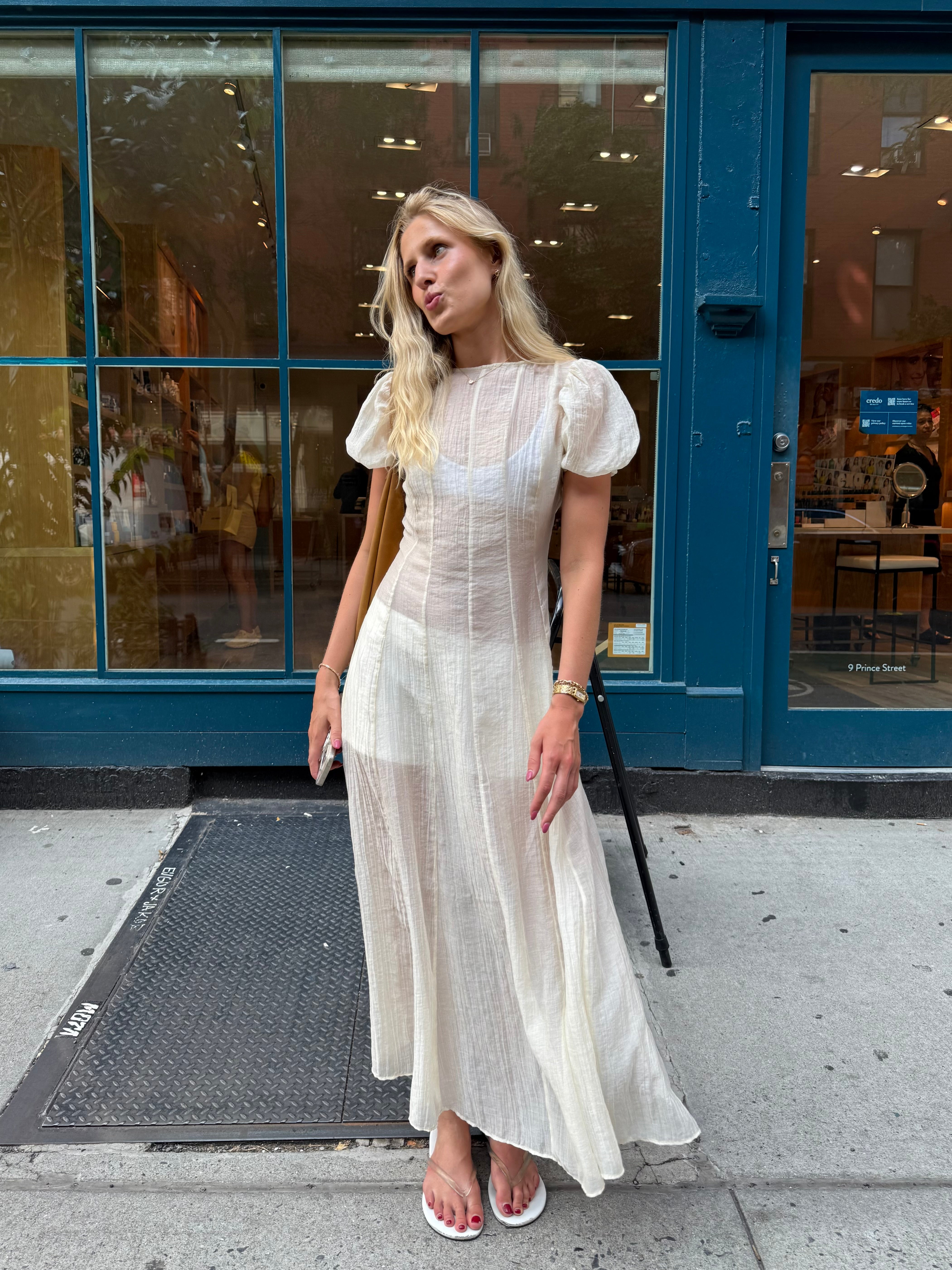 Our Emory midi features puff sleeves and semi-sheer finish. This piece comes with a mini nude slip dress for extra coverage if required.