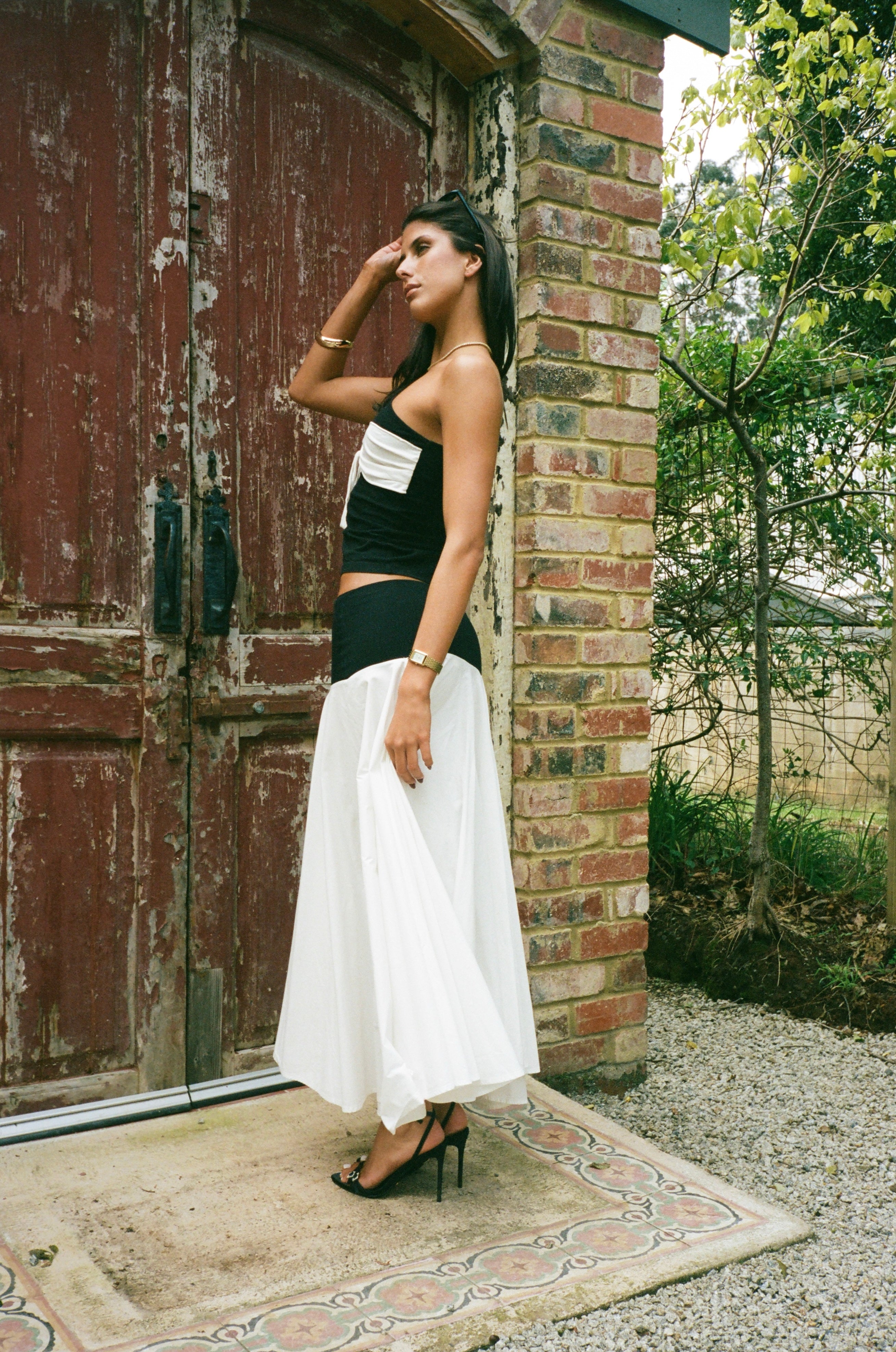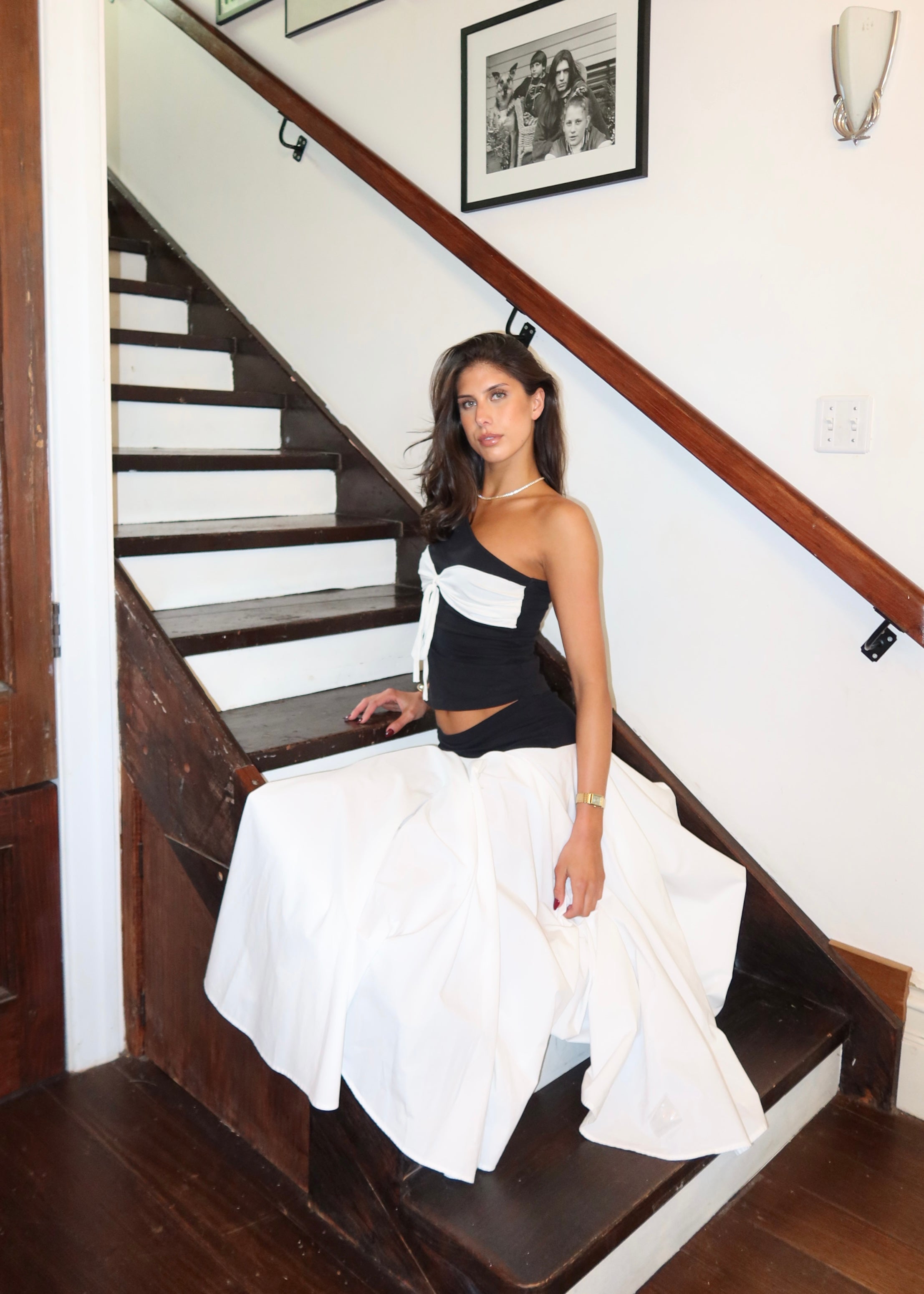 Made in Spain, Claudia features a drop waist silhouette and one shoulder top.