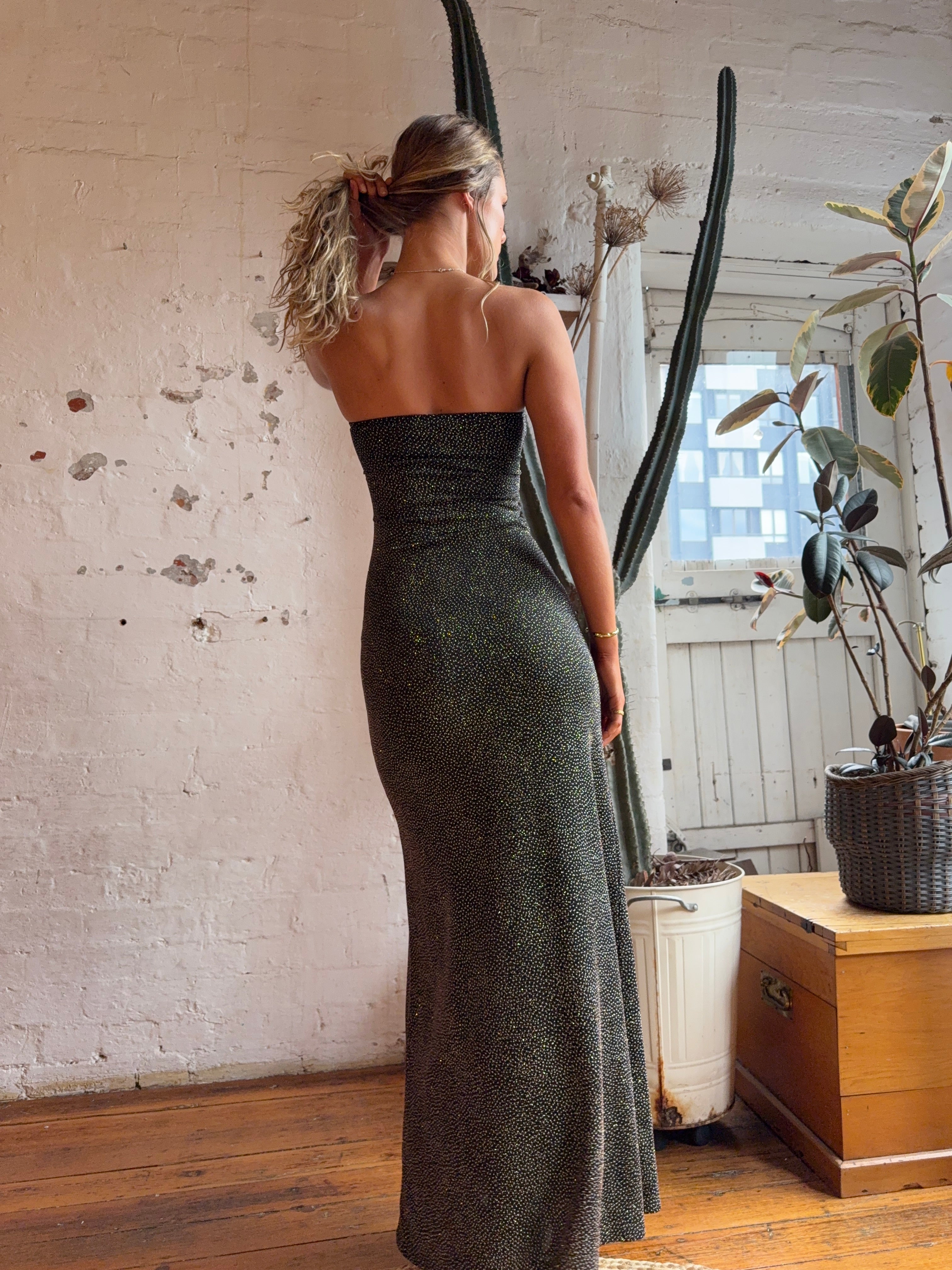 A strapless sparkle knit maxi dress with an a-line shape and a decorative twisted bralette detail at the chest. Very stretchy style, can fit 6-10.